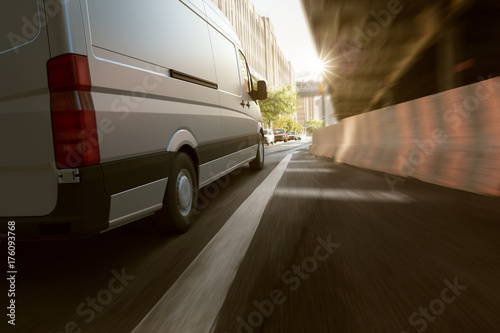 Plakat Czerwona samochód przejażdżka na asfaltowej drodze w mieście przy dniem